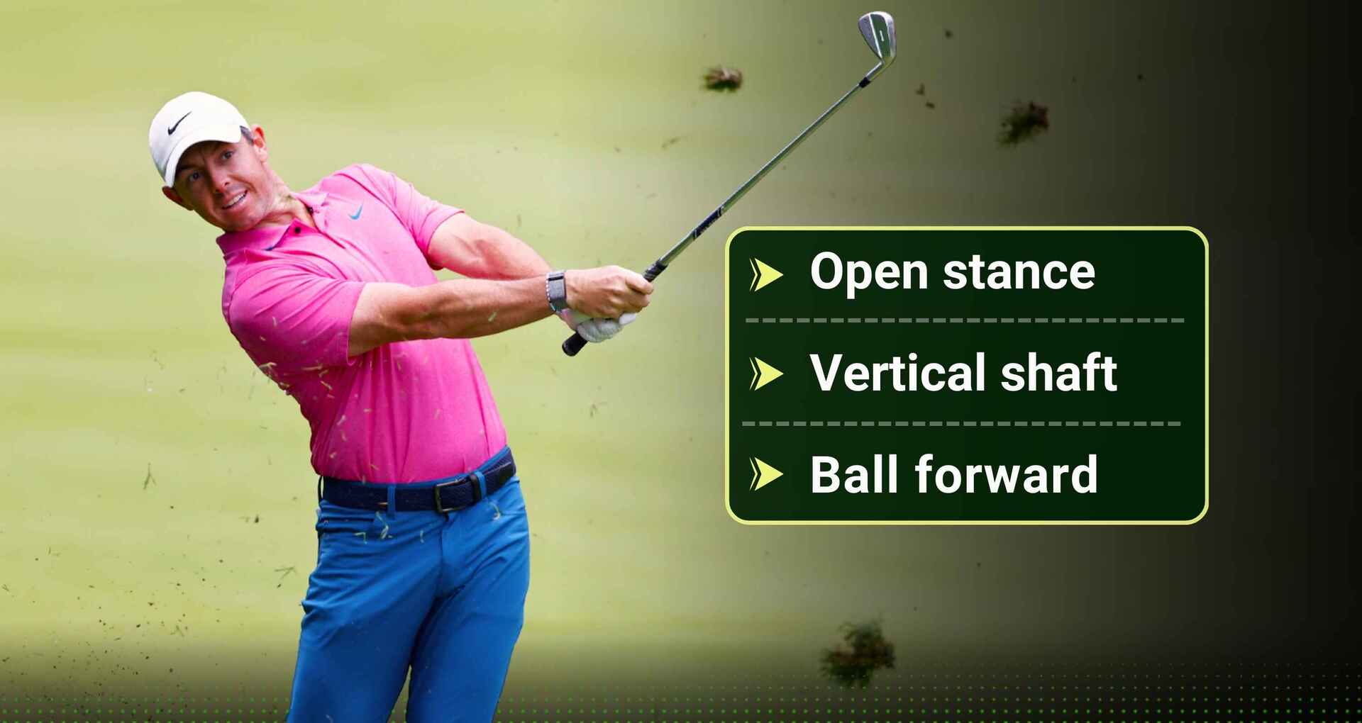 Swing: Release the trailing hand underneath the golf ball to ensure the clubface returns to the same position it was at address. Notice carefully how McIlroy does it in the tutorial below.