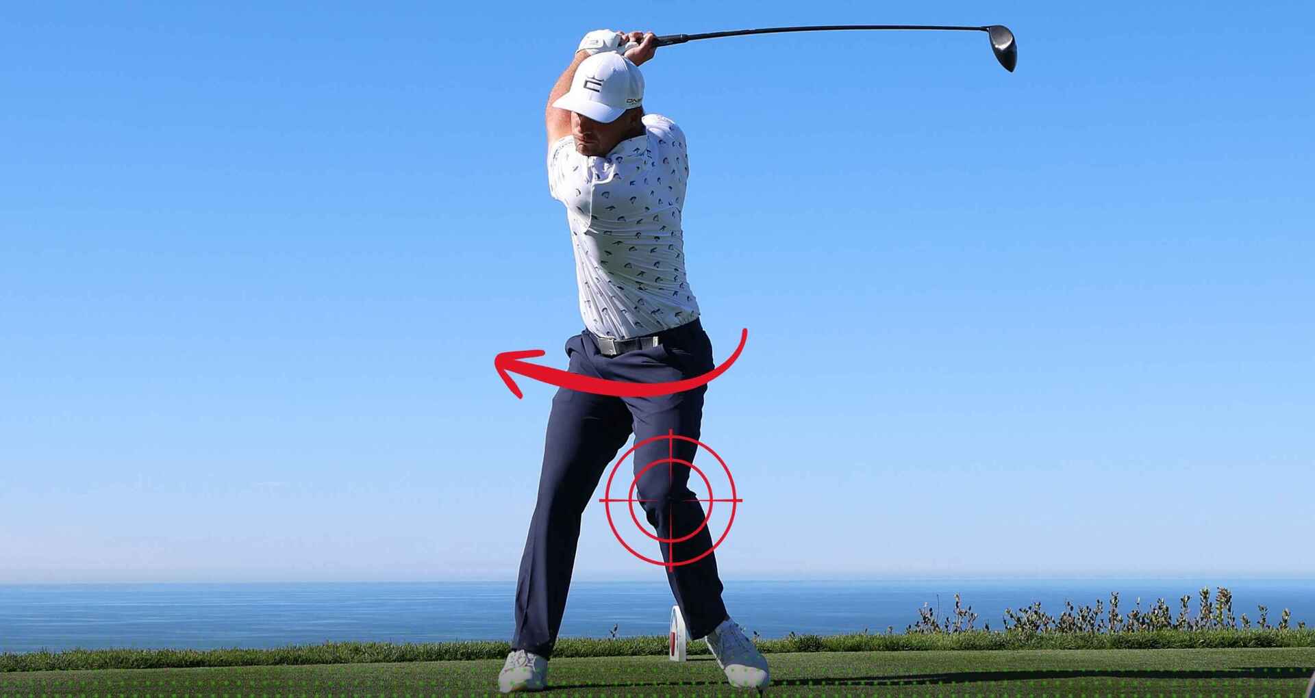 At the top of the swing, turn your hips slightly to the right, which causes the left knee to move across.