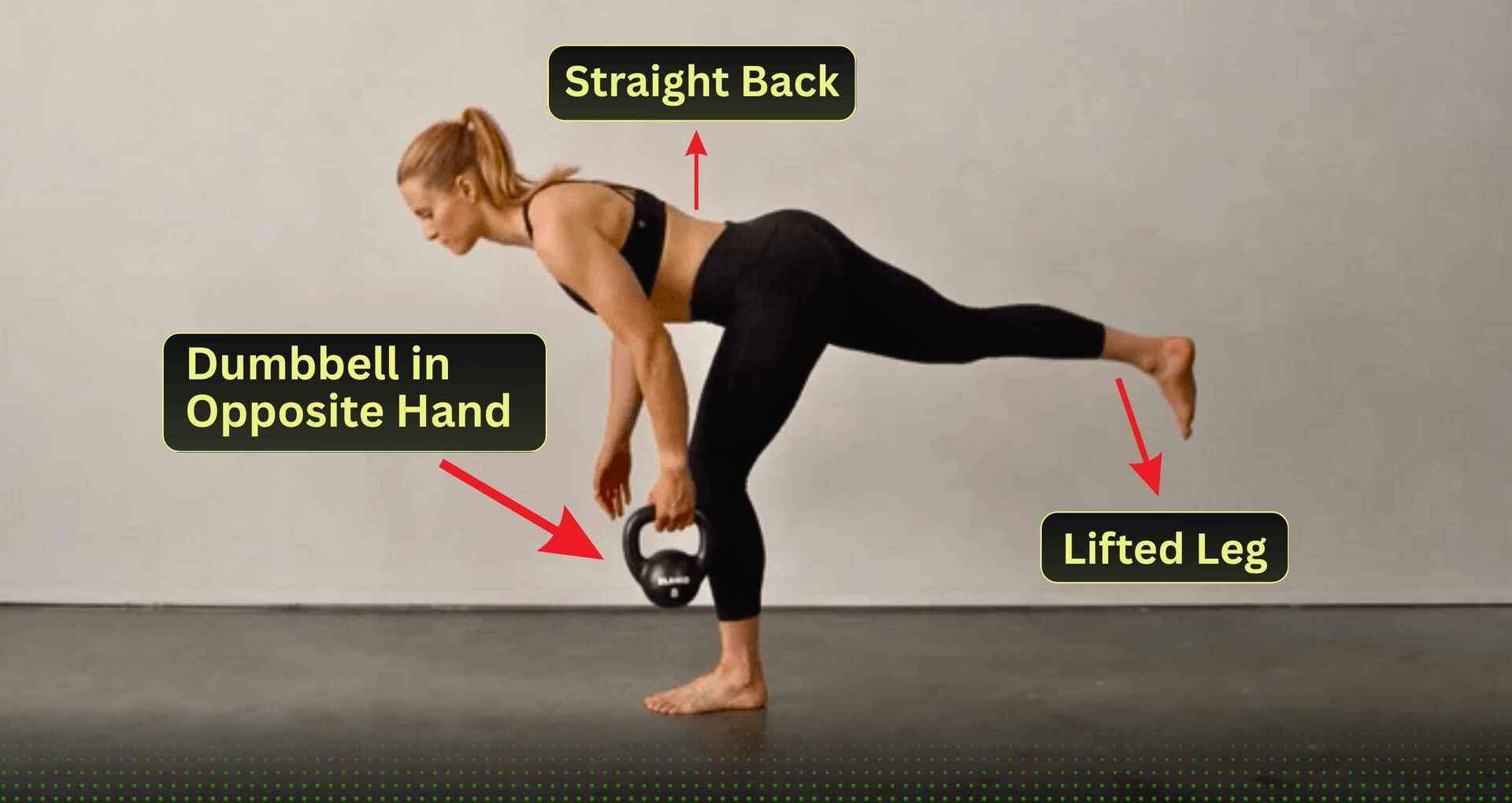 Hold a weight in the opposite hand of your planted leg. Drive the hips forward, engage your glute. Return to the starting position with a straight spine exactly as shown here.