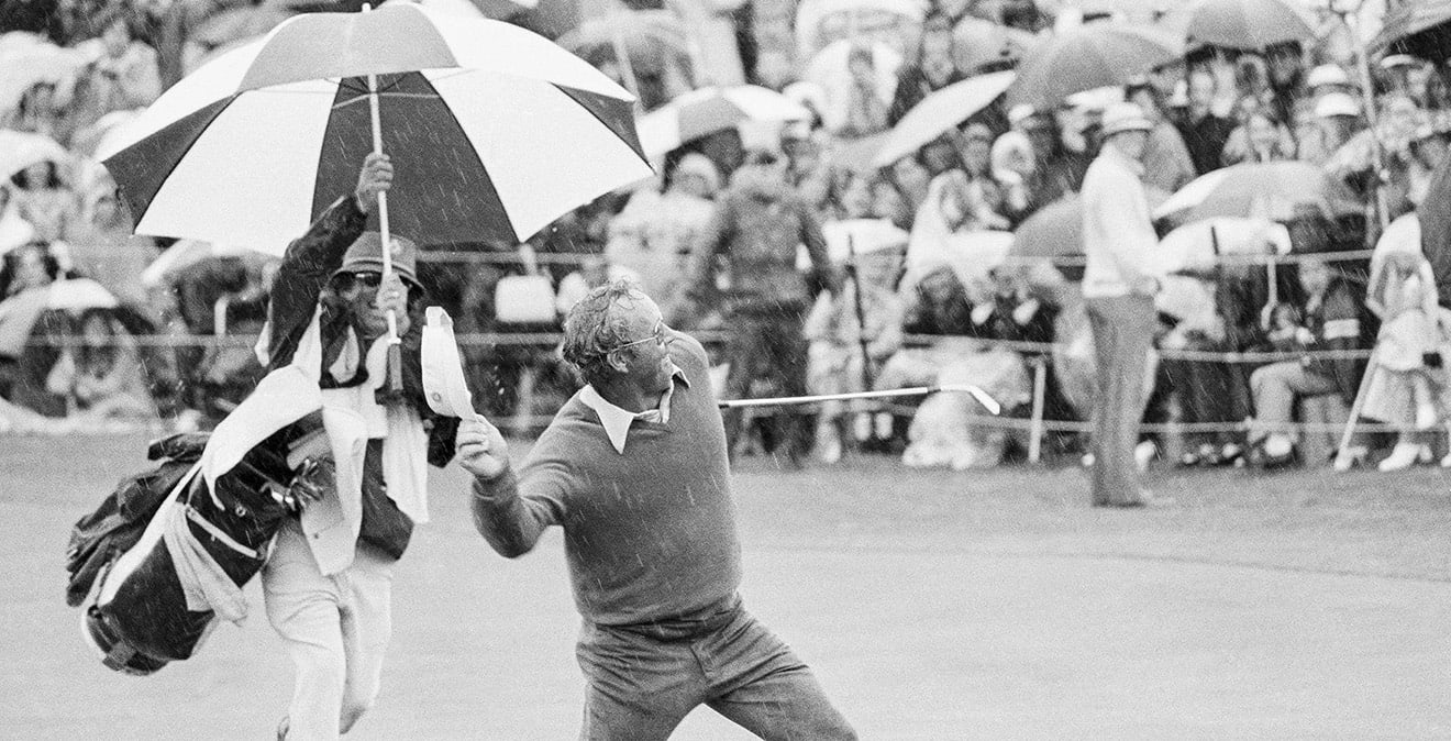 On this date in 1973, Arnold Palmer won the Bob Hope Desert Classic for his 62nd and last PGA Tour title. 43-year-old Palmer played the rainy final and fifth round without his rain suit. Needing just par on the 18th to hold off Jack Nicklaus, he drained a 7-foot birdie putt instead, firing a closing 69 to win by two strokes. Palmer, elated after snapping a 30-event winless streak in stroke-play tournaments, immediately tossed his visor into the crowd. |